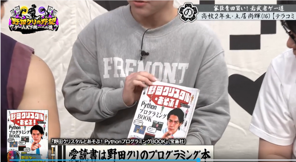 今回出演のなおきくんがプログラミングに出会ったきっかけは、小学生の頃に手に取った 野田クリスタルさんのPythonゲーム開発本でした。